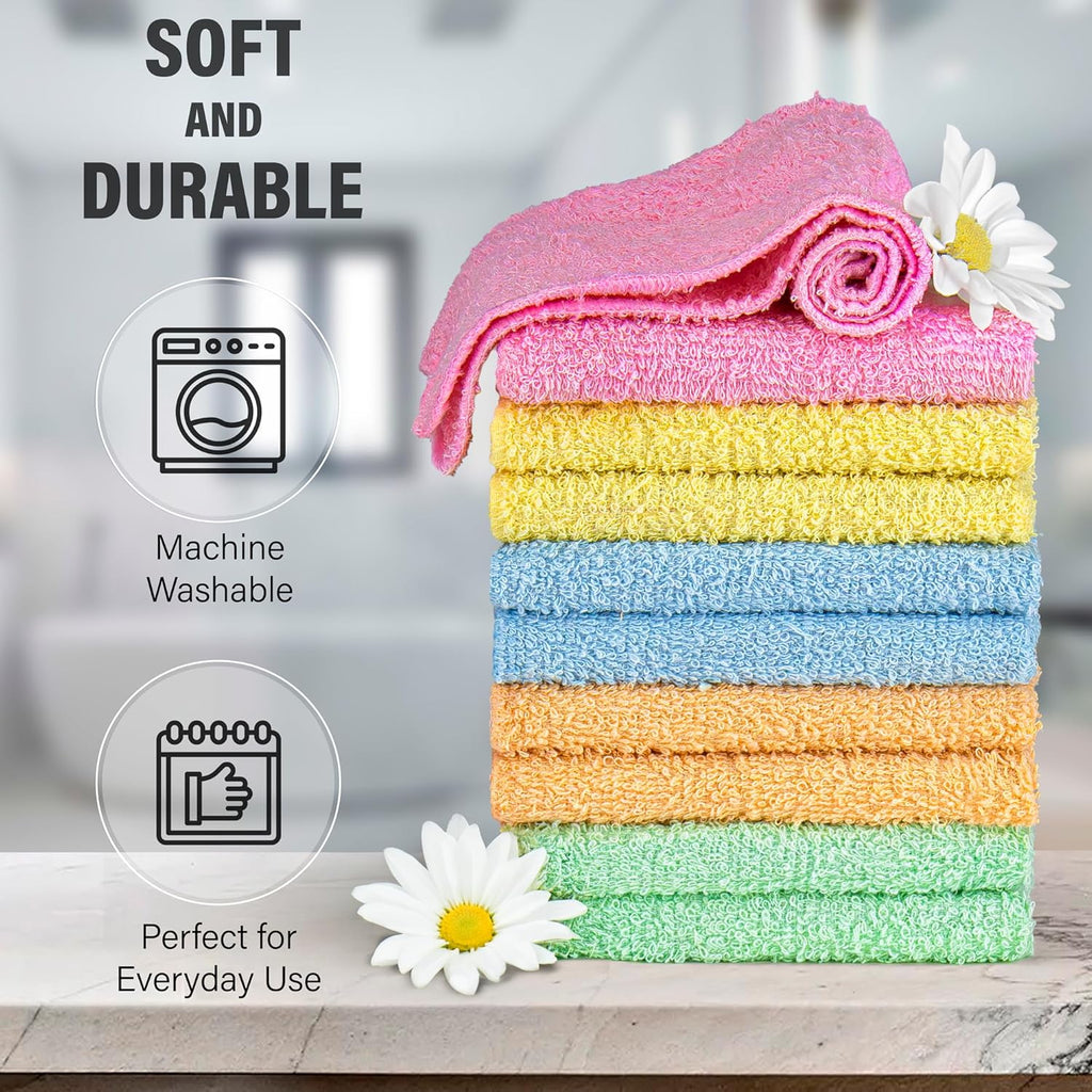 This 10-pack of 100% cotton washcloths combines quality and practicality, ensuring you always have a clean cloth ready. Each 12x12 inch washcloth is crafted from soft, highly absorbent material that gently cleanses skin while effectively soaking up moisture. The assortment of vibrant colors adds a stylish touch to any bathroom or kitchen setting. Designed for durability, these washcloths are machine washable and maintain their softness and integrity after repeated laundering. Their versatility makes them ideal for a variety of household uses, providing reliable performance every day.