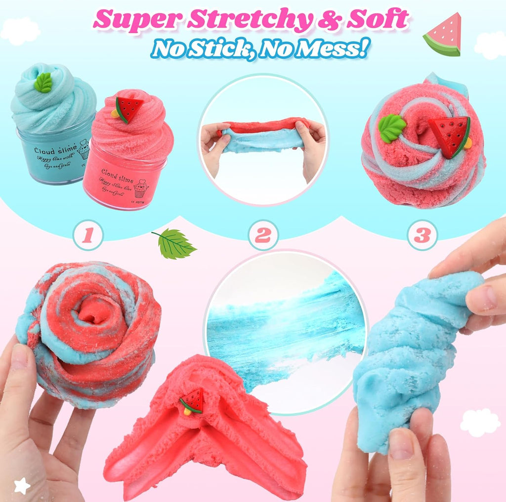 This upgraded 2 Pack Cloud Slime Kit offers a fun and creative experience with vibrant red and mint green slimes, each accompanied by realistic watermelon and mint charms. Housed in a charming gift box, it’s ideal for children’s imaginative play and sensory stress relief. Crafted from high-quality, hypoallergenic materials, the slime is ultra-soft, smooth, and non-sticky, allowing for easy stretching and shaping without drying out or crumbling. This kit combines safety and quality, making it a perfect choice for hours of engaging, tactile fun.