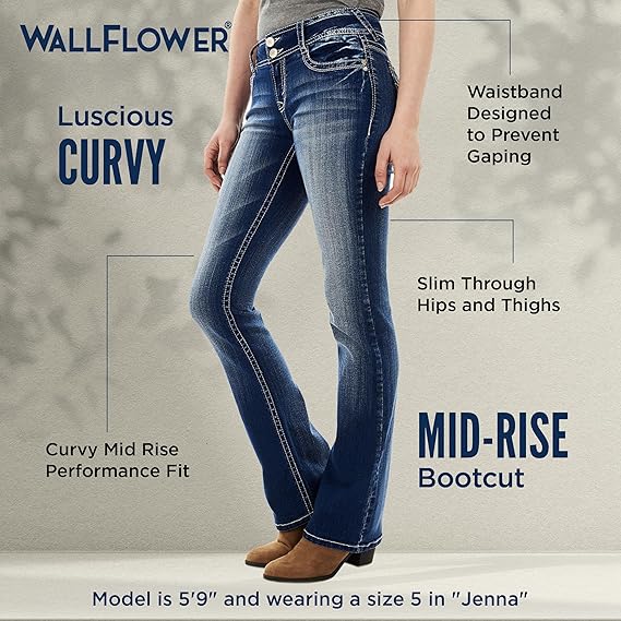 Expertly crafted Luscious Curvy Bootcut Jeans designed for sizes 0-24 with multiple inseam options. The Insta Stretch denim provides exceptional recovery while maintaining shape throughout the day. The contoured mid-rise waistband with roomier hips and thighs eliminates gapping, creating a flattering silhouette that enhances your curves. With a 32" inseam, 9" front rise, and 17.5" leg opening, these jeans deliver both comfort and style for every body type.